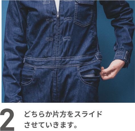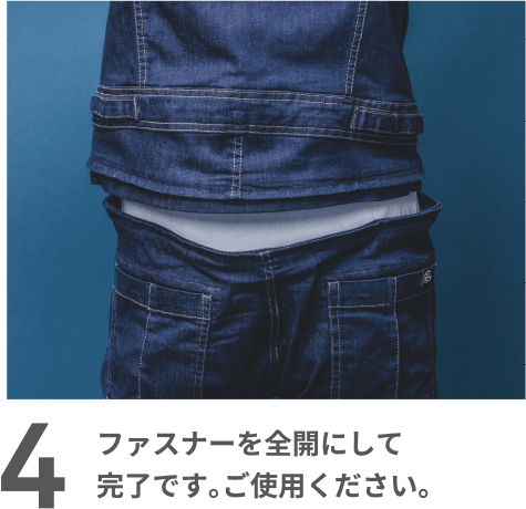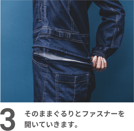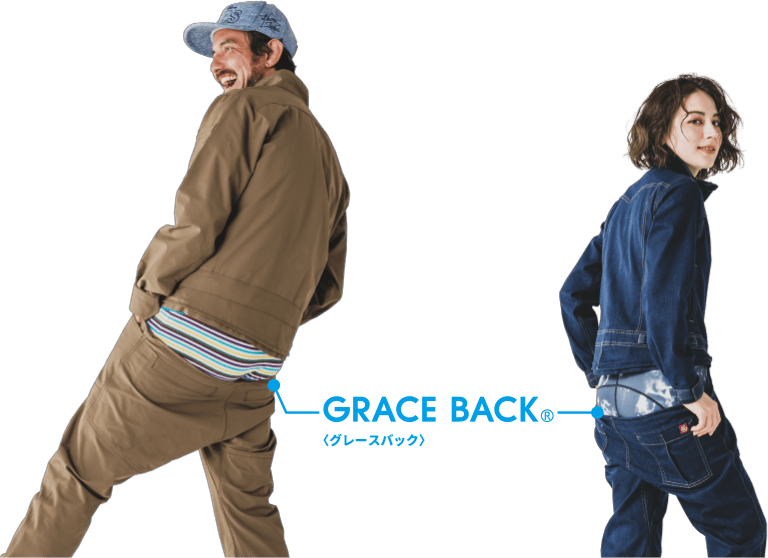 ツナギやサロペットの最大のネガティブポイントであった、お手洗い時の問題がクリアになったストレスフリーな便利機能。腰周りのファスナーで簡単に開閉が出来てヒップオープンになるので、上着部分を脱がずに用が足せます。まだお試しでない方は是非ともお試しください!『GRACE BACK®』の虜になる事間違いありません。