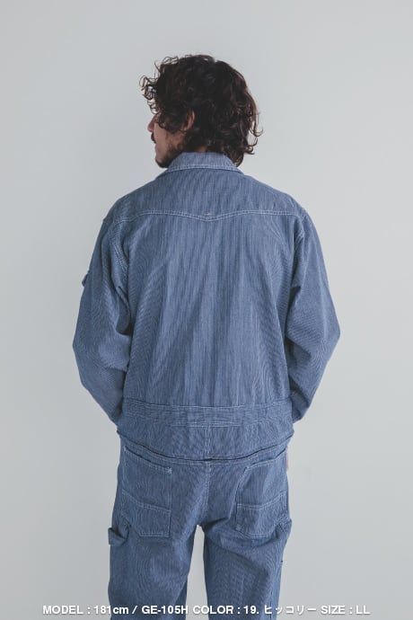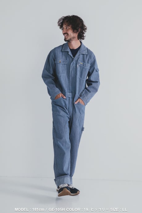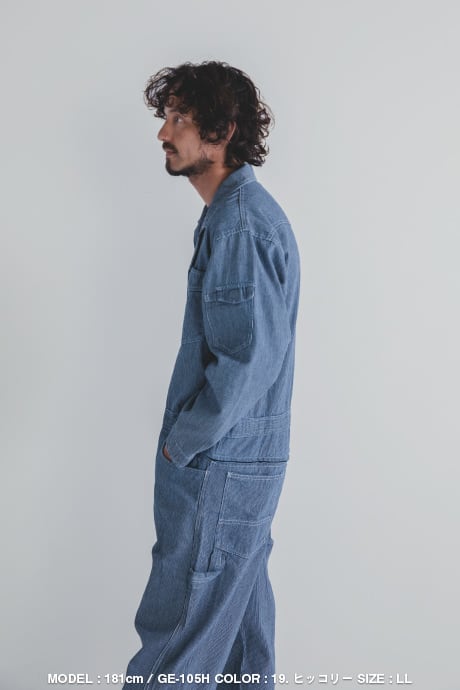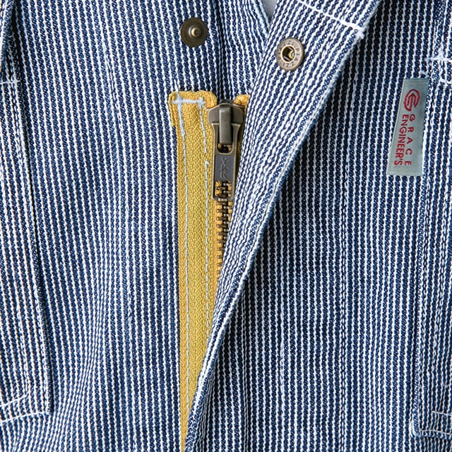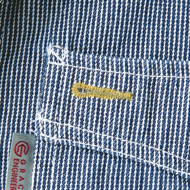 細目のヒッコリー柄が特徴的なGRACE ENGINEER’SのロングセラーモデルGE-105をベースに、特許取得のヒップオープン機能『GRACE BACK®』を搭載したスペシャルエディションです。堅牢な生地感とクラシカルなスタイリングの中に今っぽさも感じられるデザインなので、年齢や性別問わず着用可能。豊富なサイズ展開も人気でチームで揃えるのもオススメなツナギです。