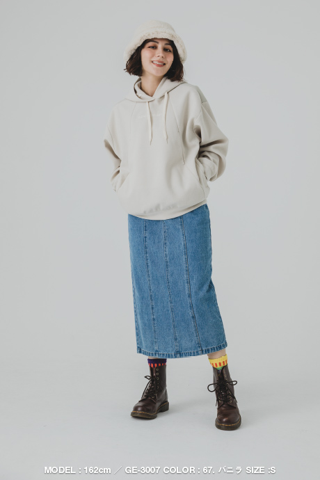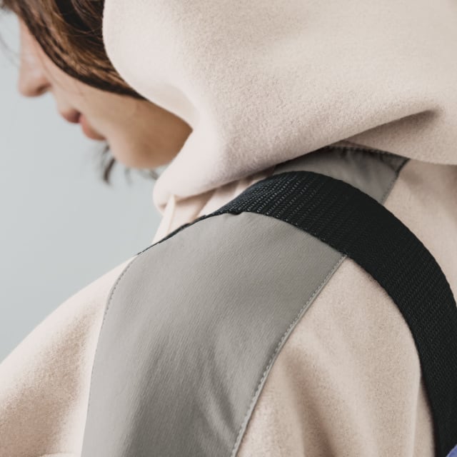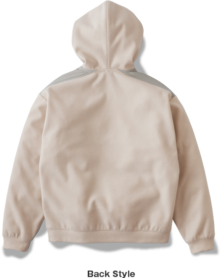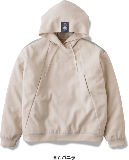 サロペット専用パーカーである“サロペ・デ・フーディー”がアップデート。サロペットの胸当て部を意識した特徴的な位置のポケットもデザイン的にワンランクアップ。サスペンダーで擦れやすい肩部分の補強布など、好評のディテールも健在。生地は温もりと優しさを感じるメルトンライクな表面と、着やすさを考えたプレーンな質感の裏面なダブルフェイス生地。ヒップオープン機能との相性を考えた丈感なのもこだわりポイントです。