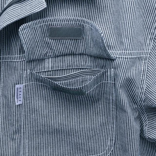 肌あたりと吸水性の高い綿と吸湿性と速乾性がある麻を合わせた夏に最適なオリジナル生地を使用。機能面でもツナギを愛する方には無くてはならない便利機能『GRACE BACK®」に加え、ウエストを内側から絞ることが出来るアジャスター、ギミック溢れる両胸ポケットなどスッキリとしたデザインとは裏腹に盛り沢山なツナギです。